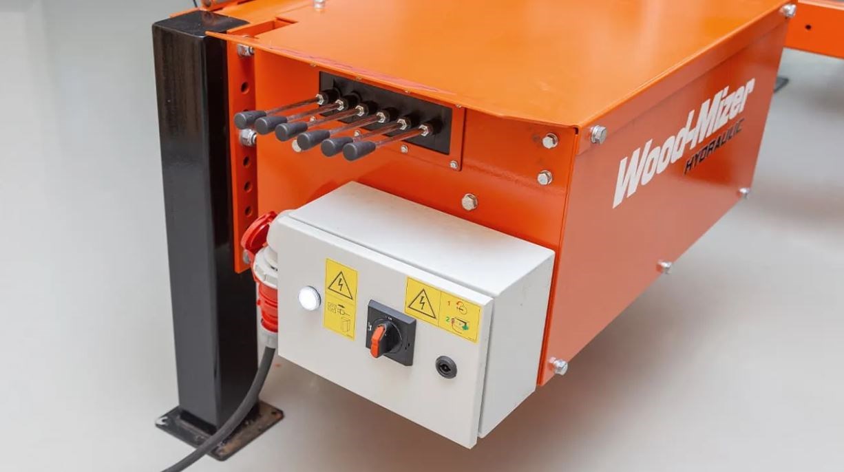 Hydraulbox med reglage för smidig hantering av stocken under sågning.